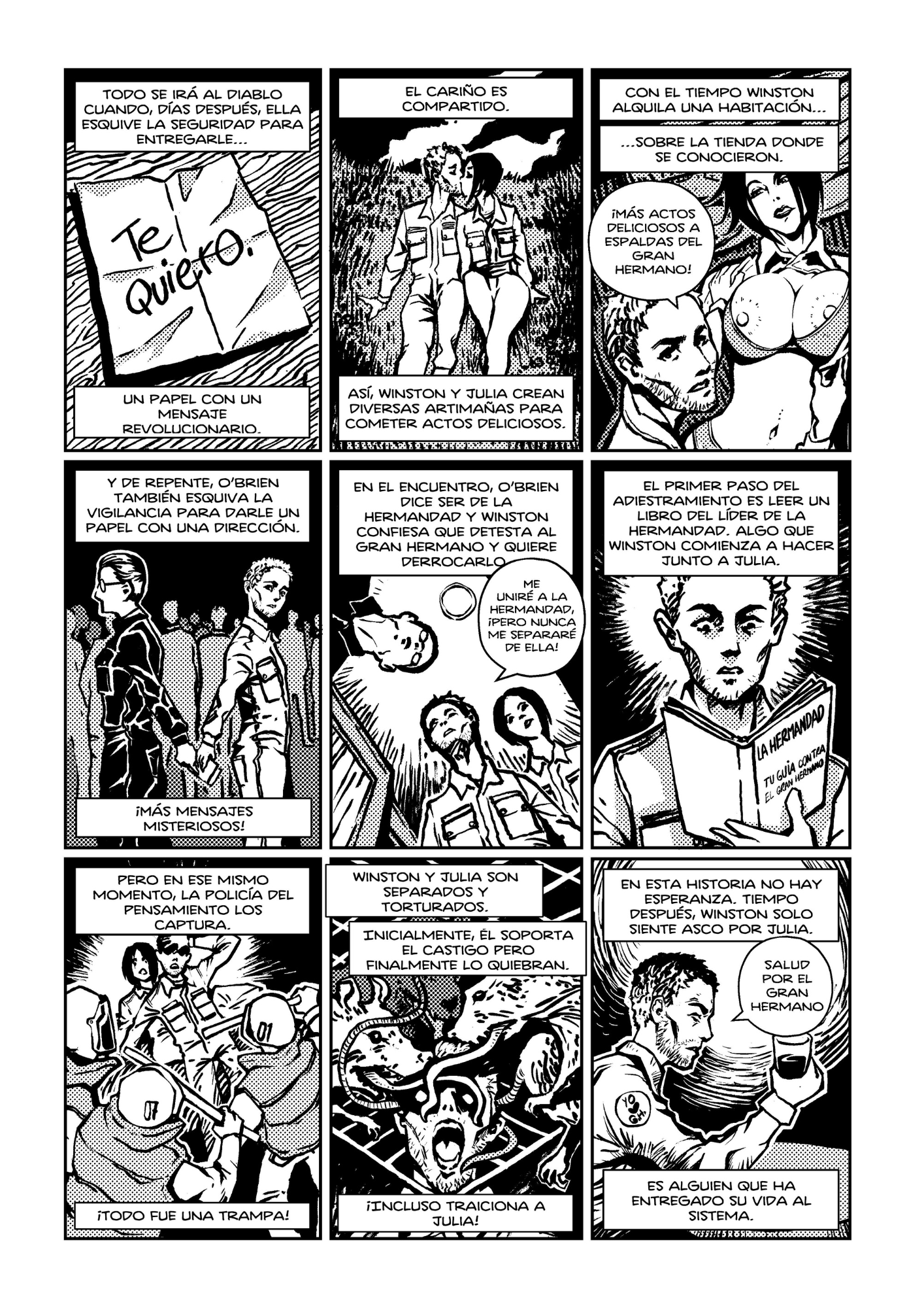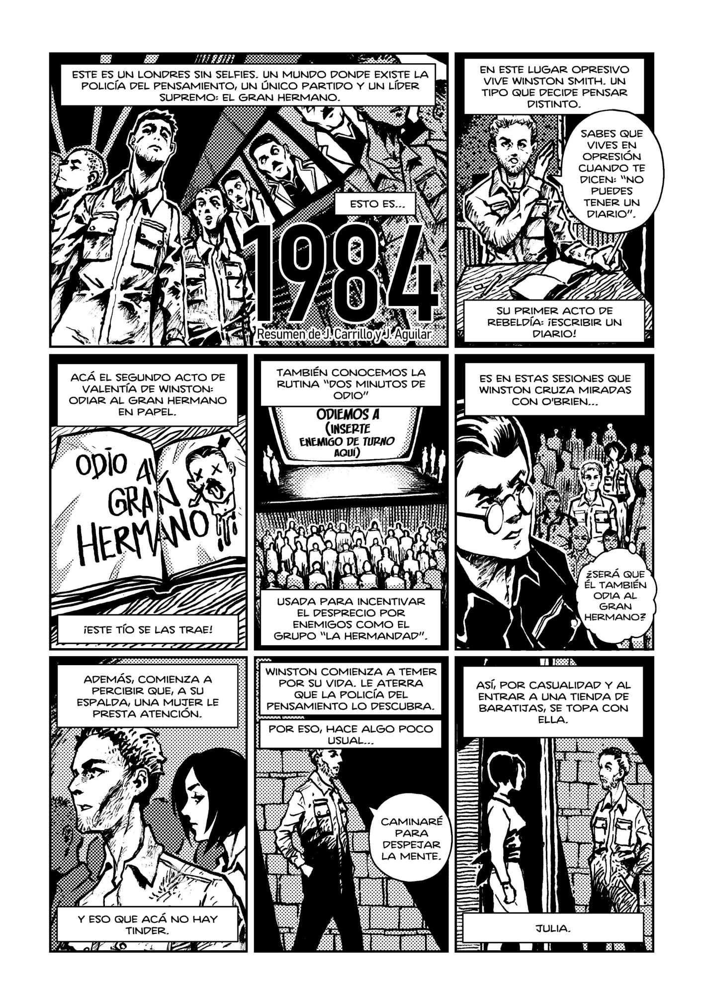 Esta es una reinterpretación gráfica libre y vertiginosa del clásico de George Orwell. Lejos de proponer una adaptación solemne o literal, este proyecto aborda el universo distópico de Orwell desde una perspectiva contemporánea, incorporando humor ácido, ritmo acelerado y una mirada visual que dialoga con la cultura mediática actual.